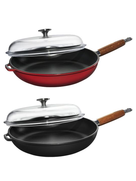 Μαντεμένιο τηγάνι 28 cm με ξύλινη λαβή και γυάλινο καπάκι, ιδανικό για να μαγειρεύετε τέλεια κρέας και λαχανικά !