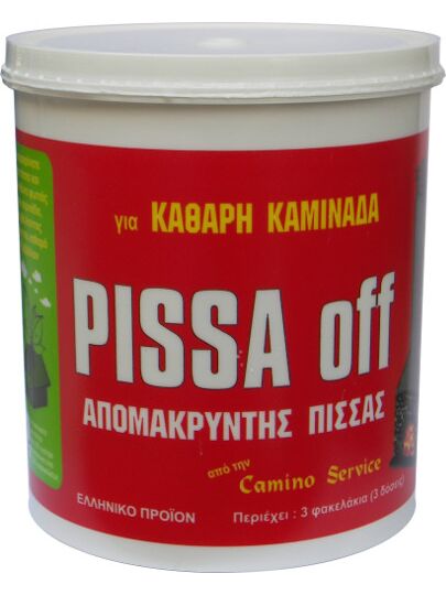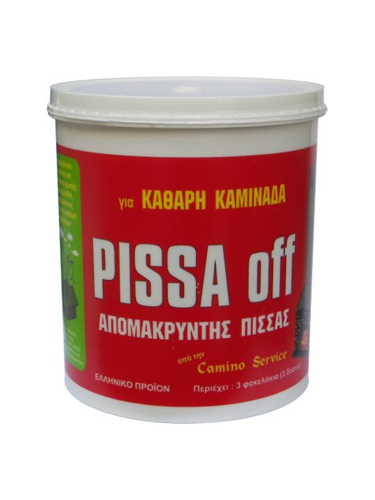 Το PISSA off είναι ένα εξειδικευμένο προϊόν απαραίτητο για να ΑΠΟΜΑΚΡΥΝΘΕΙ η πίσσα του ξύλου από τις καμινάδες των τζακιών και των καυστήρων ξύλου, καθώς και από τα μπουριά και την καμινάδα της ξυλόσομπας.