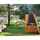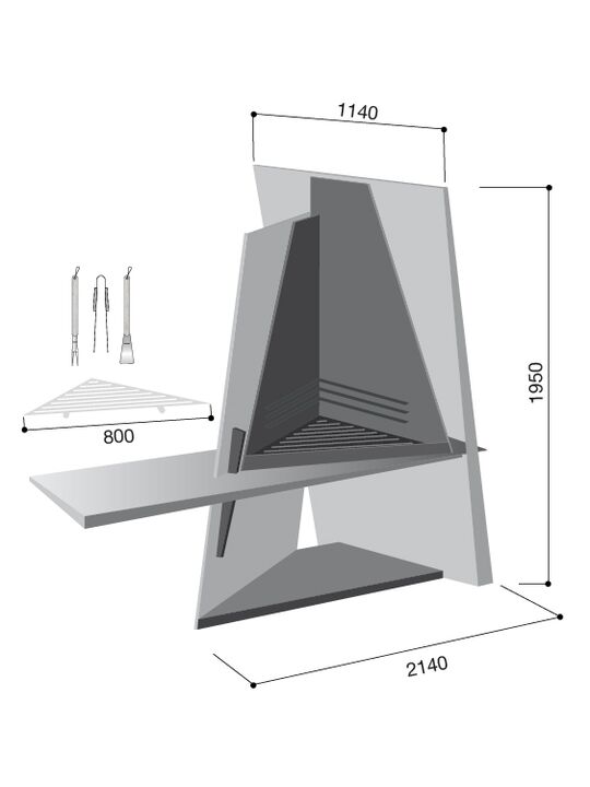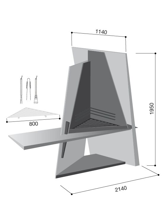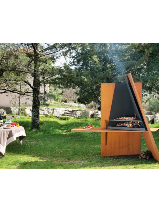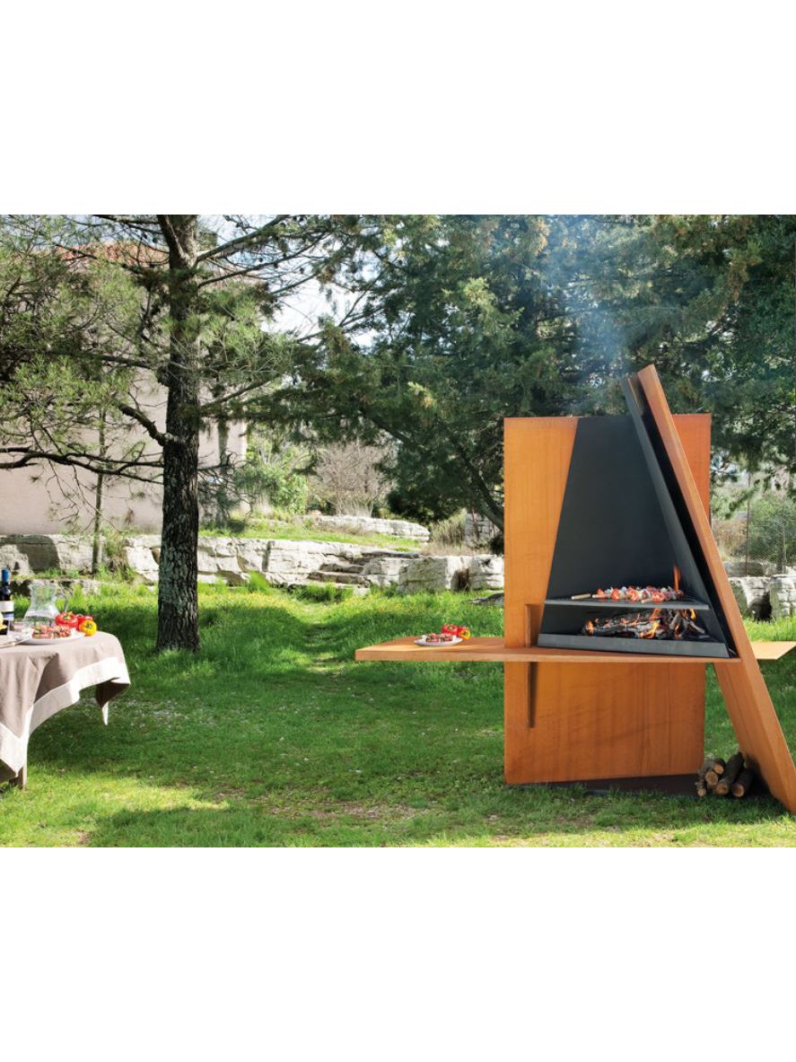 Η εκτεταμένη επιφάνεια εργασίας, ο δίσκος τέφρας, η μεγάλη τριγωνική ψησταριά (ρυθμιζόμενη σε τρία ύψη μαγειρέματος), η προστατευμένη περιοχή ψησίματος (σε μαύρο στη φωτογραφία), ο χώρος αποθήκευσης ξύλου και τα απαραίτητα σκεύη μπάρμπεκιου ενώνονται αρμονικά από τρεις σκουριασμένες χαλύβδινες πλάκες για να δημιουργήσουν έναν αριθμό εργασιών, στην υπηρεσία της παρέας και της ευχαρίστησης.