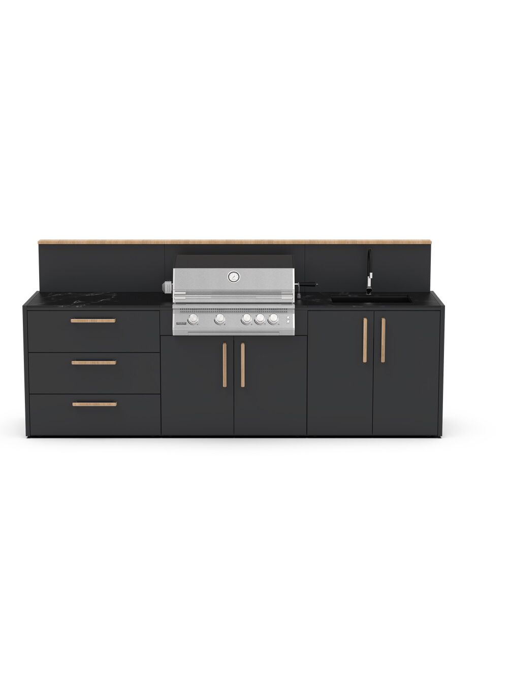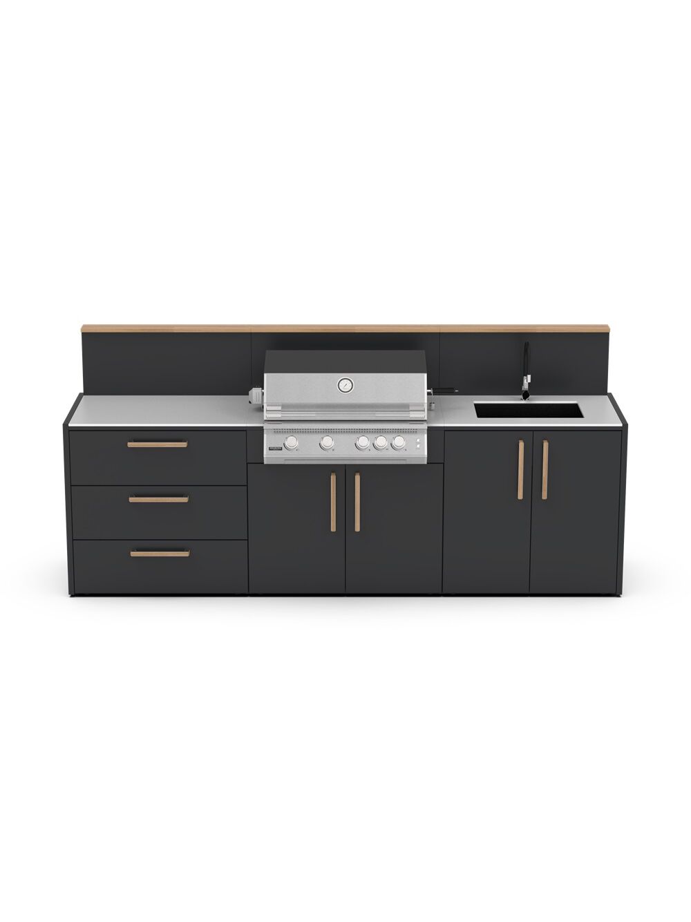 Κατασκευασμένο με υλικά υψηλής ποιότητας που αντέχουν, ο σκελετός είναι κατασκευασμένος από ανθεκτικό γαλβανισμένο ατσάλι με διπλή ηλεκτροστατική βαφή, πιστοποιημένη από την Qualicoat. Η κάθε μονάδα κουζίνας μπορεί να σχεδιαστεί ώστε να ταιριάζει άψογα με όλη τη γκάμα των μαγειρικών συσκευών, για μια ολοκληρωμένη εξωτερική κουζίνα οπως: ψησταριές αερίου και κάρβουνου, φούρνο πίτσας, νεροχύτη και αποθηκευτικούς χώρους.