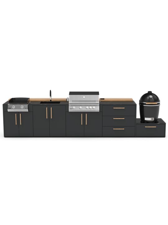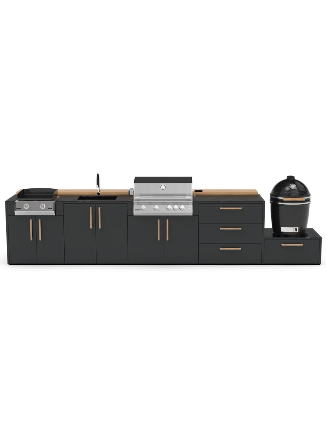 Κατασκευασμένο με υλικά υψηλής ποιότητας που αντέχουν, ο σκελετός είναι κατασκευασμένος από ανθεκτικό γαλβανισμένο ατσάλι με διπλή ηλεκτροστατική βαφή, πιστοποιημένη από την Qualicoat. Η κάθε μονάδα κουζίνας μπορεί να σχεδιαστεί ώστε να ταιριάζει άψογα με όλη τη γκάμα των μαγειρικών συσκευών, για μια ολοκληρωμένη εξωτερική κουζίνα οπως: ψησταριές αερίου και κάρβουνου, φούρνο πίτσας, νεροχύτη και αποθηκευτικούς χώρους.