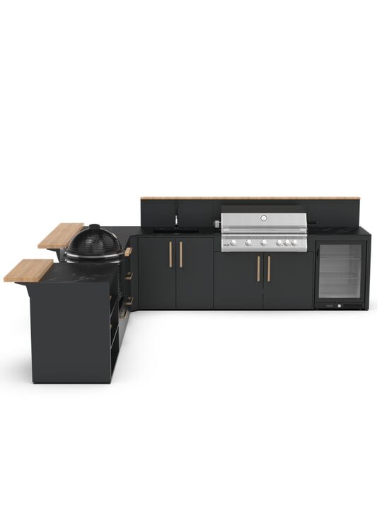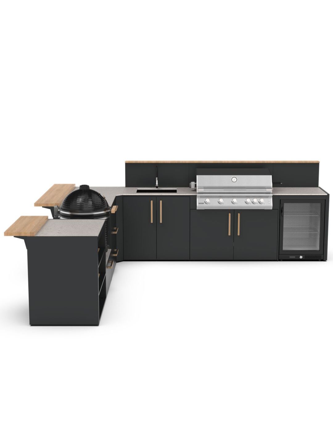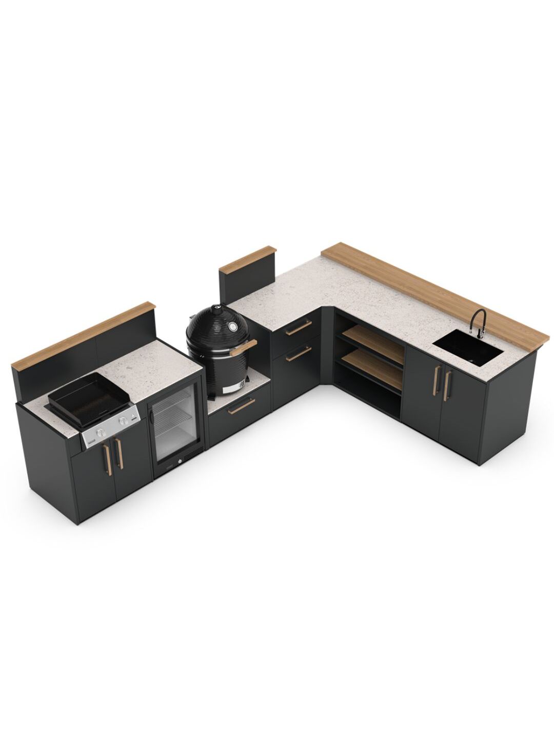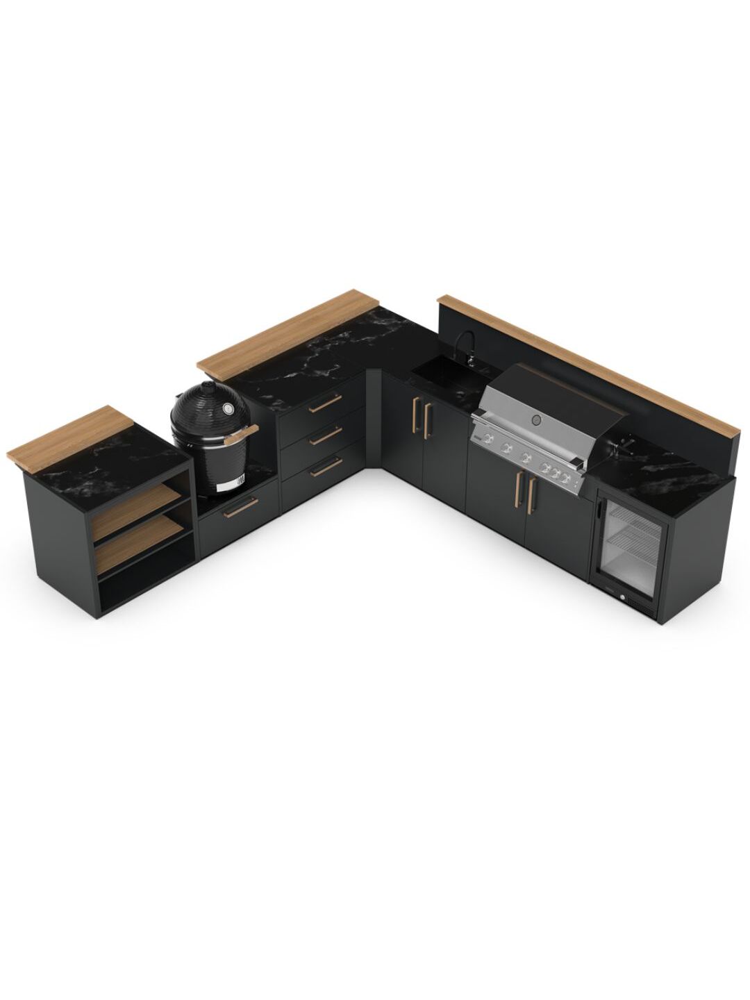 Κατασκευασμένο με υλικά υψηλής ποιότητας που αντέχουν, ο σκελετός είναι κατασκευασμένος από ανθεκτικό γαλβανισμένο ατσάλι με διπλή ηλεκτροστατική βαφή, πιστοποιημένη από την Qualicoat. Η κάθε μονάδα κουζίνας μπορεί να σχεδιαστεί ώστε να ταιριάζει άψογα με όλη τη γκάμα των μαγειρικών συσκευών, για μια ολοκληρωμένη εξωτερική κουζίνα οπως: ψησταριές αερίου και κάρβουνου, φούρνο πίτσας, νεροχύτη και αποθηκευτικούς χώρους.