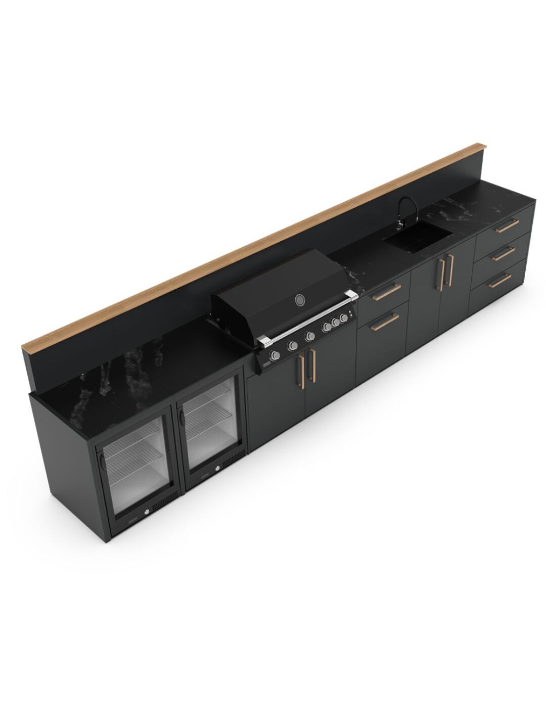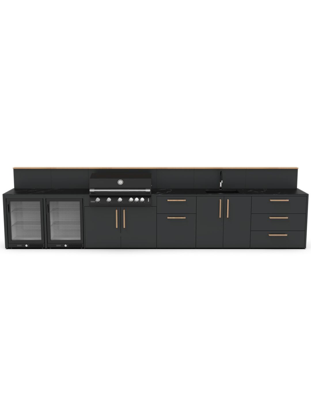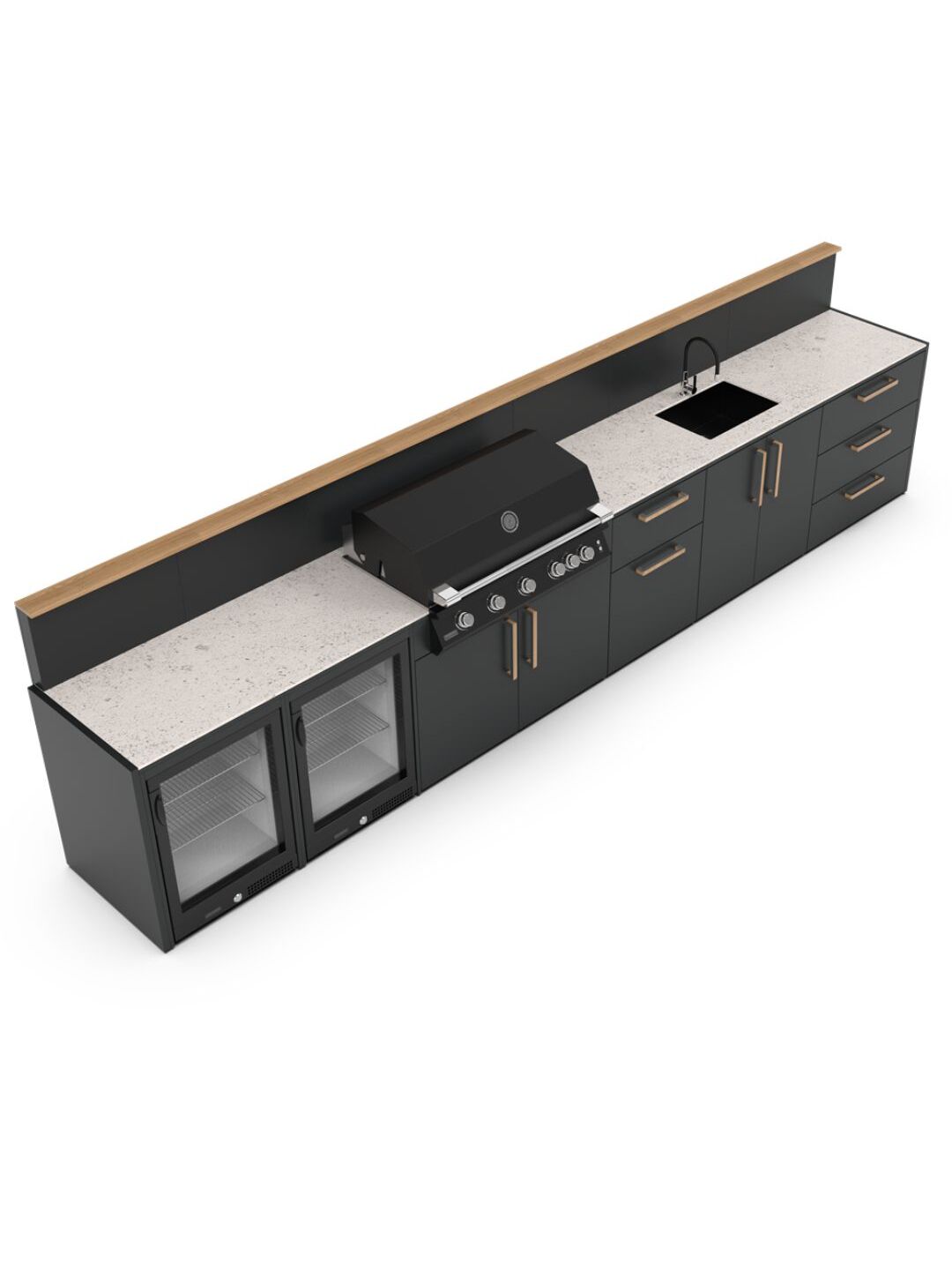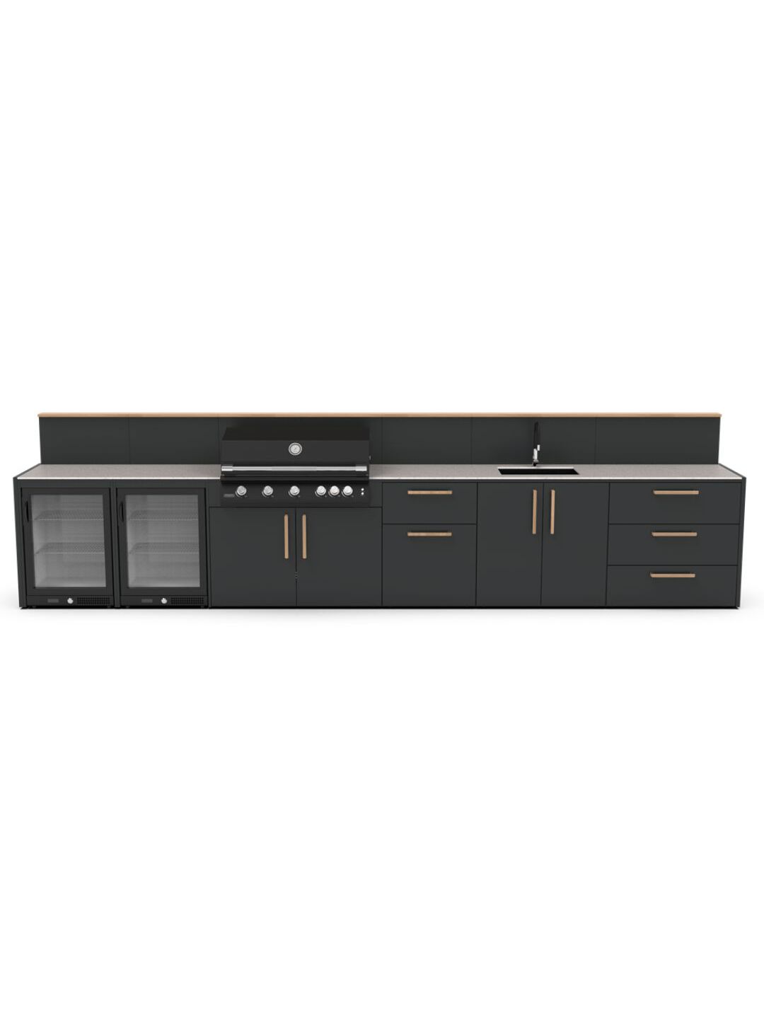 Κατασκευασμένο με υλικά υψηλής ποιότητας που αντέχουν, ο σκελετός είναι κατασκευασμένος από ανθεκτικό γαλβανισμένο ατσάλι με διπλή ηλεκτροστατική βαφή, πιστοποιημένη από την Qualicoat. Η κάθε μονάδα κουζίνας μπορεί να σχεδιαστεί ώστε να ταιριάζει άψογα με όλη τη γκάμα των μαγειρικών συσκευών, για μια ολοκληρωμένη εξωτερική κουζίνα οπως: ψησταριές αερίου και κάρβουνου, φούρνο πίτσας, νεροχύτη και αποθηκευτικούς χώρους.