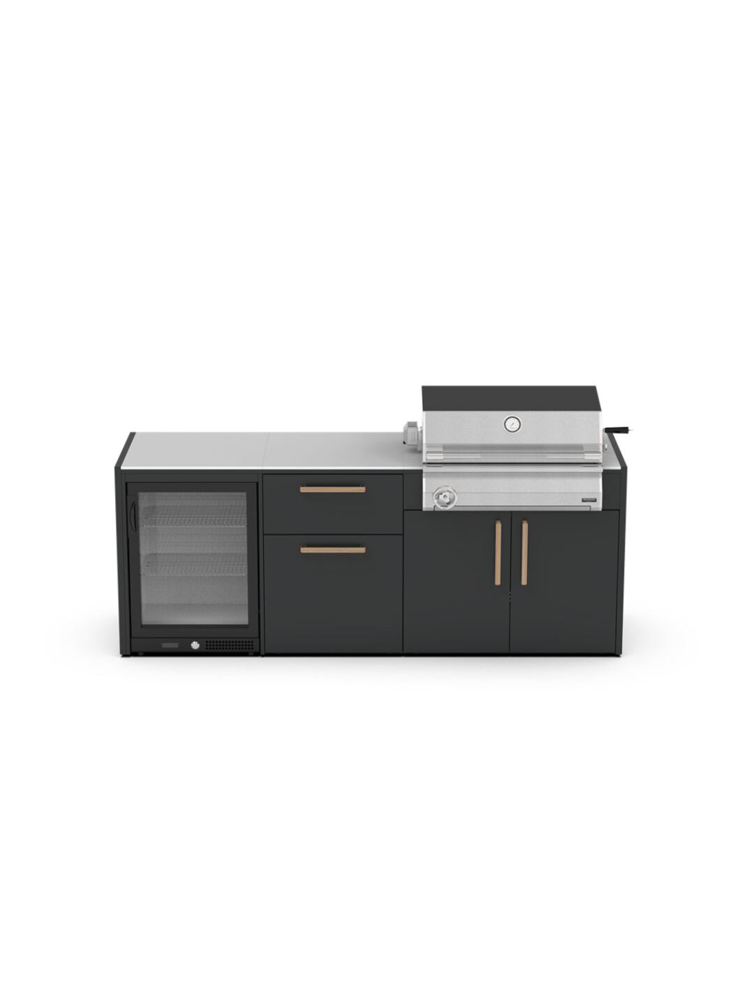 Κατασκευασμένο με υλικά υψηλής ποιότητας που αντέχουν, ο σκελετός είναι κατασκευασμένος από ανθεκτικό γαλβανισμένο ατσάλι με διπλή ηλεκτροστατική βαφή, πιστοποιημένη από την Qualicoat. Η κάθε μονάδα κουζίνας μπορεί να σχεδιαστεί ώστε να ταιριάζει άψογα με όλη τη γκάμα των μαγειρικών συσκευών, για μια ολοκληρωμένη εξωτερική κουζίνα οπως: ψησταριές αερίου και κάρβουνου, φούρνο πίτσας, νεροχύτη και αποθηκευτικούς χώρους.