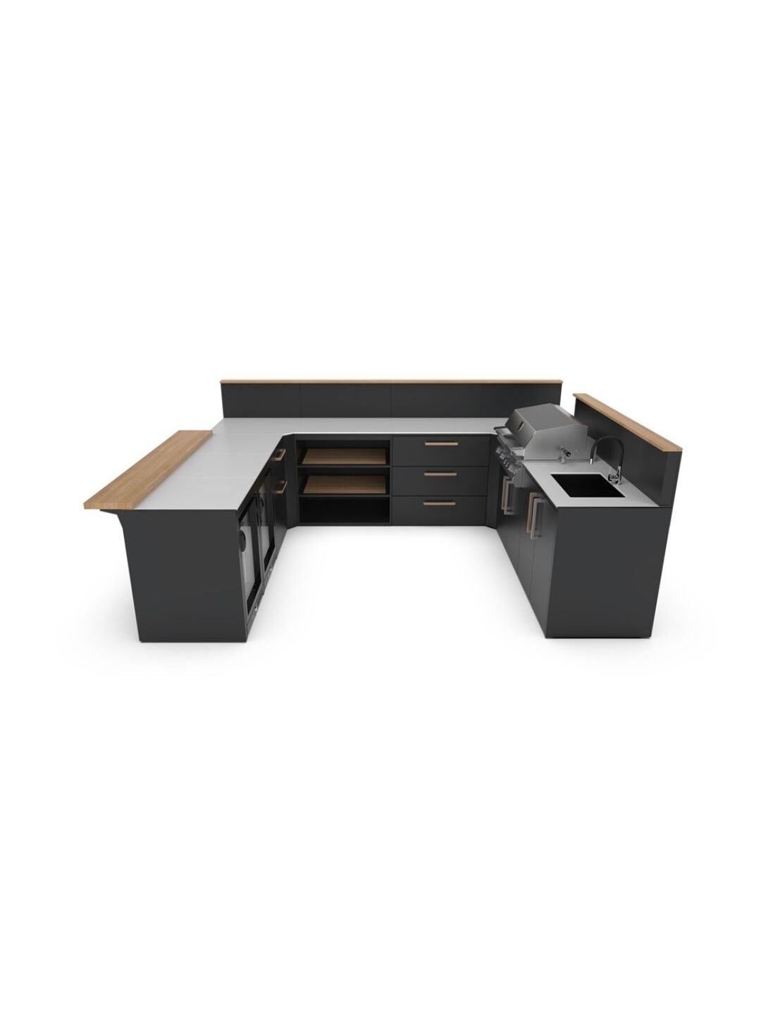 Κατασκευασμένο με υλικά υψηλής ποιότητας που αντέχουν, ο σκελετός είναι κατασκευασμένος από ανθεκτικό γαλβανισμένο ατσάλι με διπλή ηλεκτροστατική βαφή, πιστοποιημένη από την Qualicoat. Η κάθε μονάδα κουζίνας μπορεί να σχεδιαστεί ώστε να ταιριάζει άψογα με όλη τη γκάμα των μαγειρικών συσκευών, για μια ολοκληρωμένη εξωτερική κουζίνα οπως: ψησταριές αερίου και κάρβουνου, φούρνο πίτσας, νεροχύτη και αποθηκευτικούς χώρους.