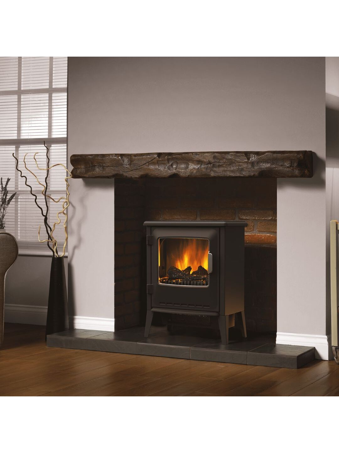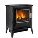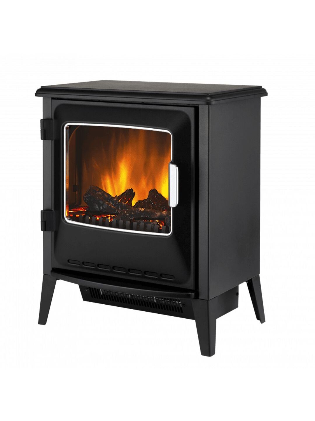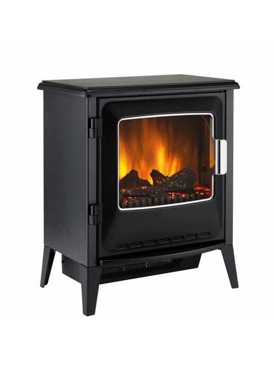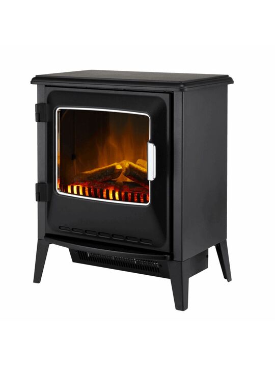 Επιδαπέδιο ηλεκτρικό τζάκι σε σχέδιο κλασικής σόμπας, με μαύρο μεταλλικό πλαίσιο, απομίμηση ξύλων, ανοιγόμενη μπροστινή πόρτα και inox λεπτομέρειες. Ο ζεστός αέρας εξέρχεται από το κάτω μέρος της μονάδας και θερμαίνει το χώρο σας, ενώ η εικονική φλόγα, τεχνολογίας Optiflame®, και τα ρεαλιστικά κούτσουρα με εσωτερικό φωτισμό που τρεμοπαίζει, διακρίνονται πίσω από το τζάμι της πόρτας, συνδυάζοντας την παραδοσιακή εμφάνιση με την σύγχρονη τεχνολογία για τη δημιουργία μιας ζεστής ατμόσφαιρας στο χώρο σας. Οι διαστάσεις του επιτρέπουν την τοποθέτηση ακόμα και σε δωμάτια μικρού μεγέθους. Διαθέτει θερμοστάτη και τηλεχειριστήριο.